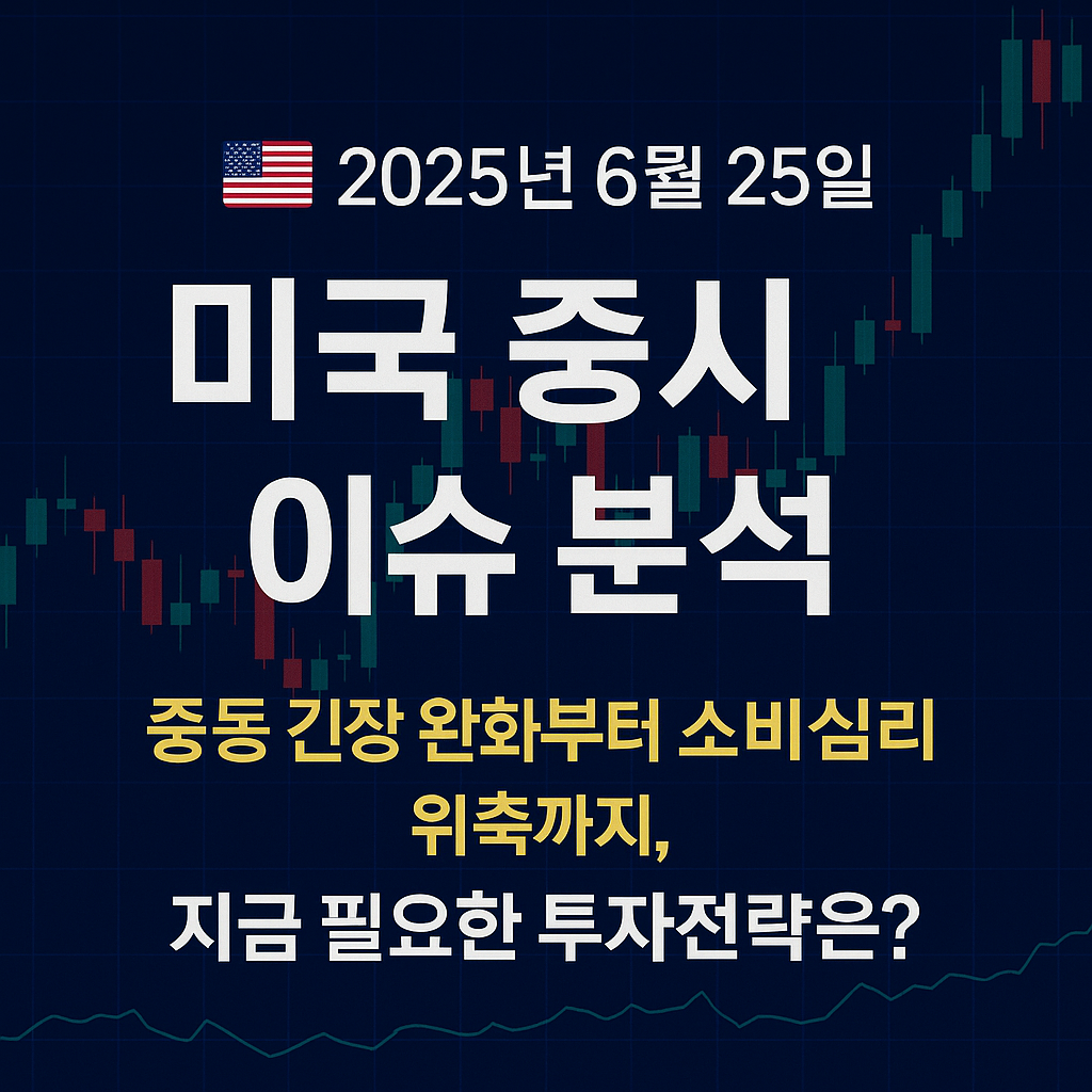 🇺🇸 2025년 6월 25일 미국증시 이슈 분석중동 긴장 완화부터 소비심리 위축까지, 지금 필요한 투자전략은?오늘 미국 시장은 여러 가지 신호를 동시에 쏟아냈다.하루에도 몇 번씩 분위기가 바뀌는 요즘 시장 속에서, 오늘은 오히려 조용한 불안함보다 명확한 흐름이 보였던 날이었다.중동 지역에서의 긴장감이 다소 누그러졌고, 소비자 심리는 확연히 식어 있었다.이런 가운데 채권금리는 빠르게 내려왔고, 금리 인하를 향한 기대감은 분명 더 커졌다.PCE와 GDP 발표를 앞두고 시장은 스스로 방향을 찾기보다는 잠시 기다리는 자세로 돌아선 듯한 느낌이었다.나는 오늘 시장을 보며 ‘방향은 기술주와 방어주로 갈라지고 있고, 중립적인 포지션을 유지하는 것이 현명하겠다’는 판단을 하게 되었다.그 판단의 배경이 된 핵심 이슈..