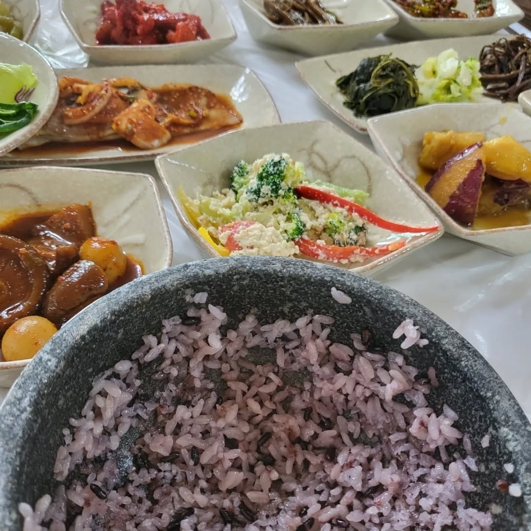 보랏빛 찹쌀밥이 갓 지어져 고슬고슬하고, 마지막엔 고소한 누룽지까지 즐길 수 있습니다.