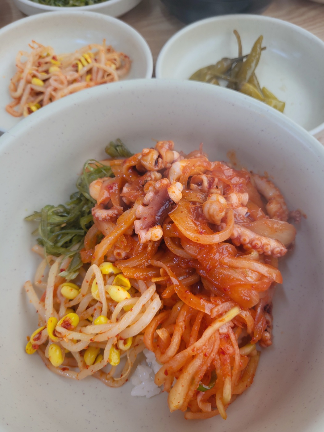 함께 나오는 밑반찬들도 인상적입니다. 된장찌개, 김, 무생채, 미역줄기볶음, 콩나물무침 등 간단하지만 하나하나 정갈하게 담겨 나와 입맛을 돋워줍니다. 특히 매콤한 낙지볶음을 밥 위에 얹고 김에 싸서 먹는 순간, 진정한 '강릉 한 끼'가 완성됩니다.
