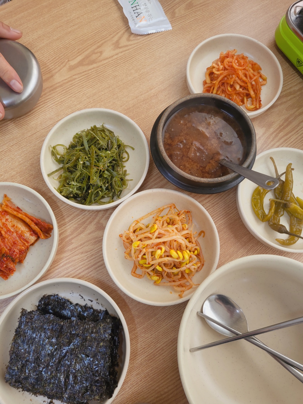 함께 나오는 밑반찬들도 인상적입니다. 된장찌개, 김, 무생채, 미역줄기볶음, 콩나물무침 등 간단하지만 하나하나 정갈하게 담겨 나와 입맛을 돋워줍니다. 특히 매콤한 낙지볶음을 밥 위에 얹고 김에 싸서 먹는 순간, 진정한 '강릉 한 끼'가 완성됩니다.