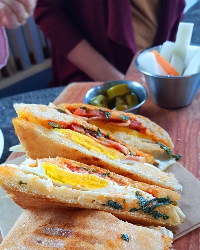 바삭하게 구워진 빵과 두툼한 계란, 신선한 토마토, 베이컨, 치즈가 듬뿍 들어가 한입에 먹는 맛이 아주 풍부합니다.