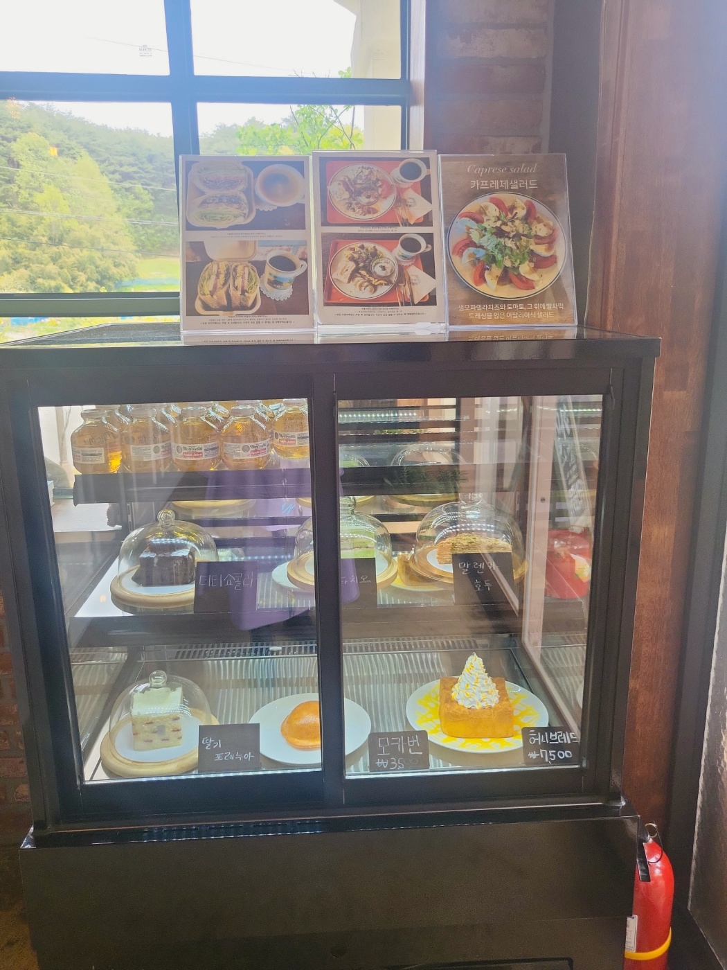 카페 내부는 통창으로 햇살이 부드럽게 들어오고, 나무 난로가 따뜻하고 아늑한 분위기를 더해줍니다.