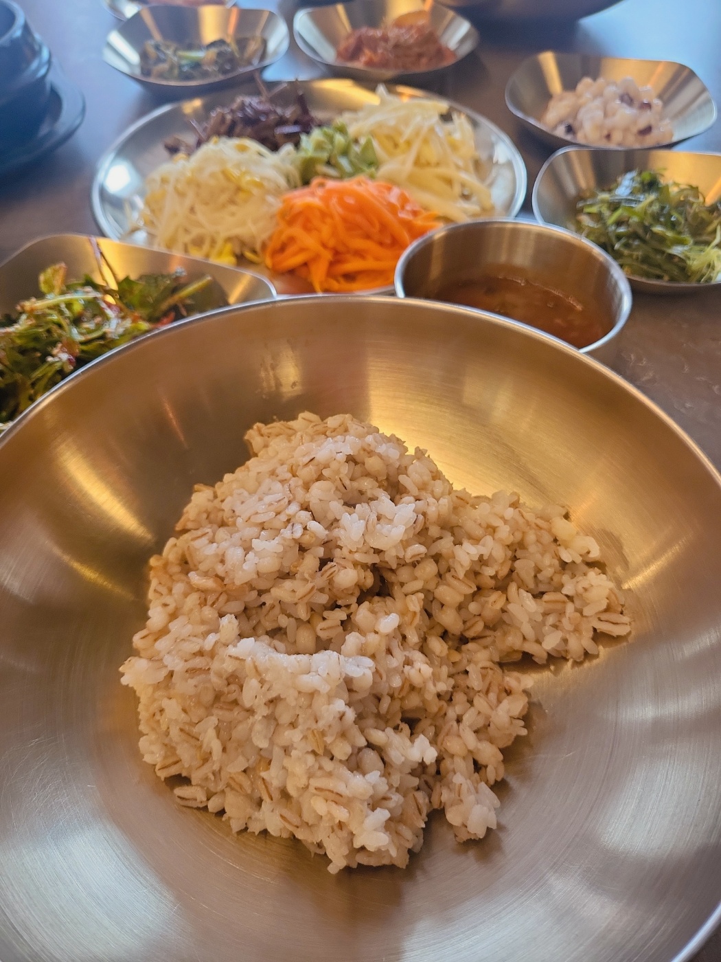 식사를 시작하기 전, 따뜻한 호박죽이나 누룽지 숭늉이 제공되어 속을 부드럽게 달래줍니다. 본 식사는 건강한 곡물인 보리밥을 중심으로 여러 가지 나물 반찬과 함께 나오며, 고소한 참기름, 강된장, 고추장을 넣고 비벼 먹는 방식입니다.