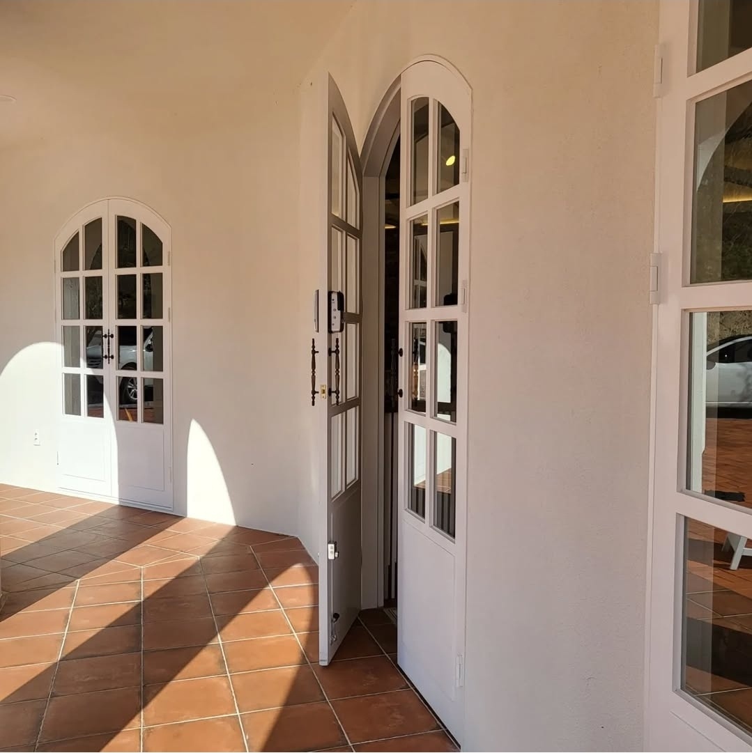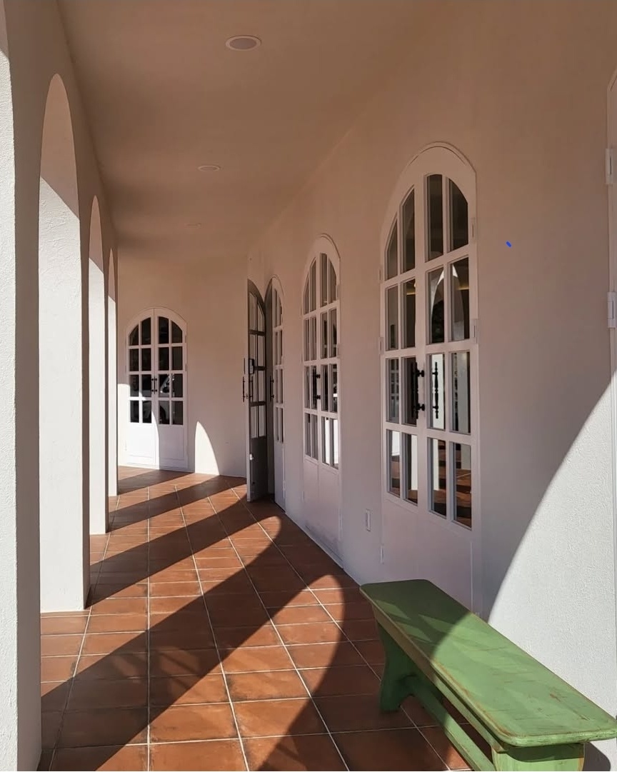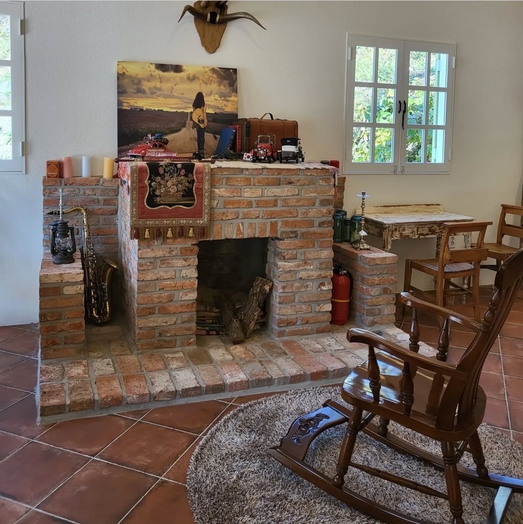 붉은 벽돌 건물 외관에 높은 천장, 아치형 창문, 그리고 따뜻한 우드톤 인테리어가 조화를 이루며 한적한 자연과 어우러져 있어요.