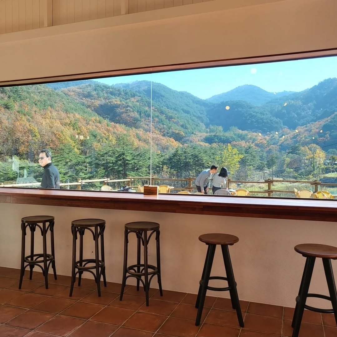 창밖으로 펼쳐진 숲과 산 전망은 커피보다 더 깊은 여운을 남기고,