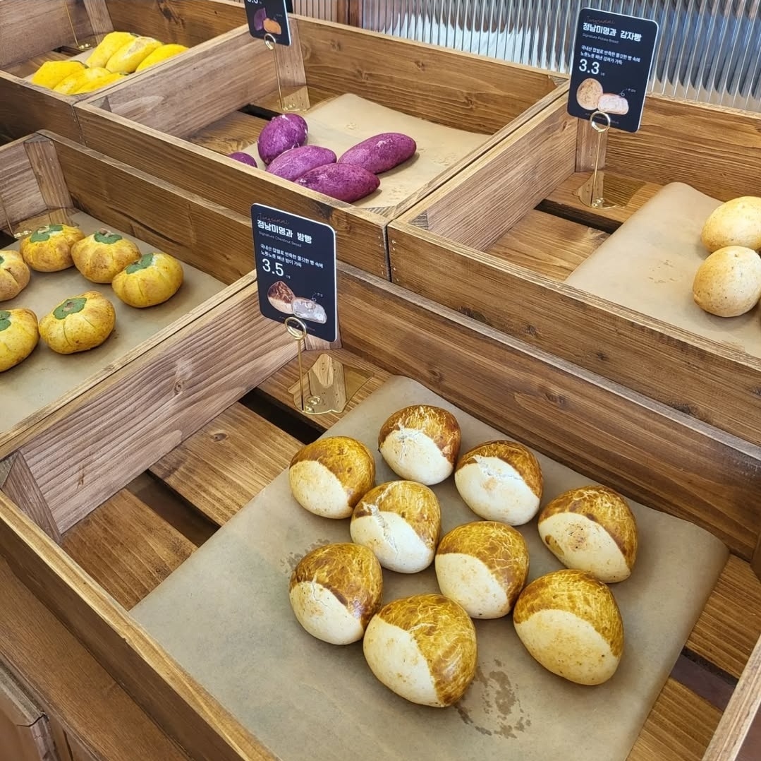 고구마빵은 찹쌀 반죽 특유의 쫀득한 식감과 고구마 소의 부드러운 단맛이 조화를 이루며, 감자빵은 담백하고 든든한 맛이 매력적이었습니다. 단호박빵은 은은한 단맛이, 밤빵은 통밤이 들어 있어 고급스러움을 더하고, 옥수수빵은 고소한 풍미가 인상적이었습니다.
