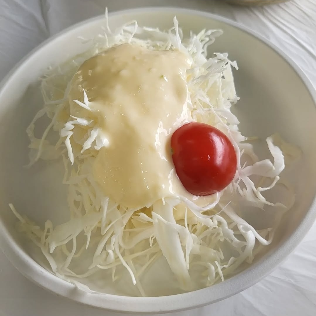 얇게 채 썬 양배추 위에 달콤한 크리미 소스,