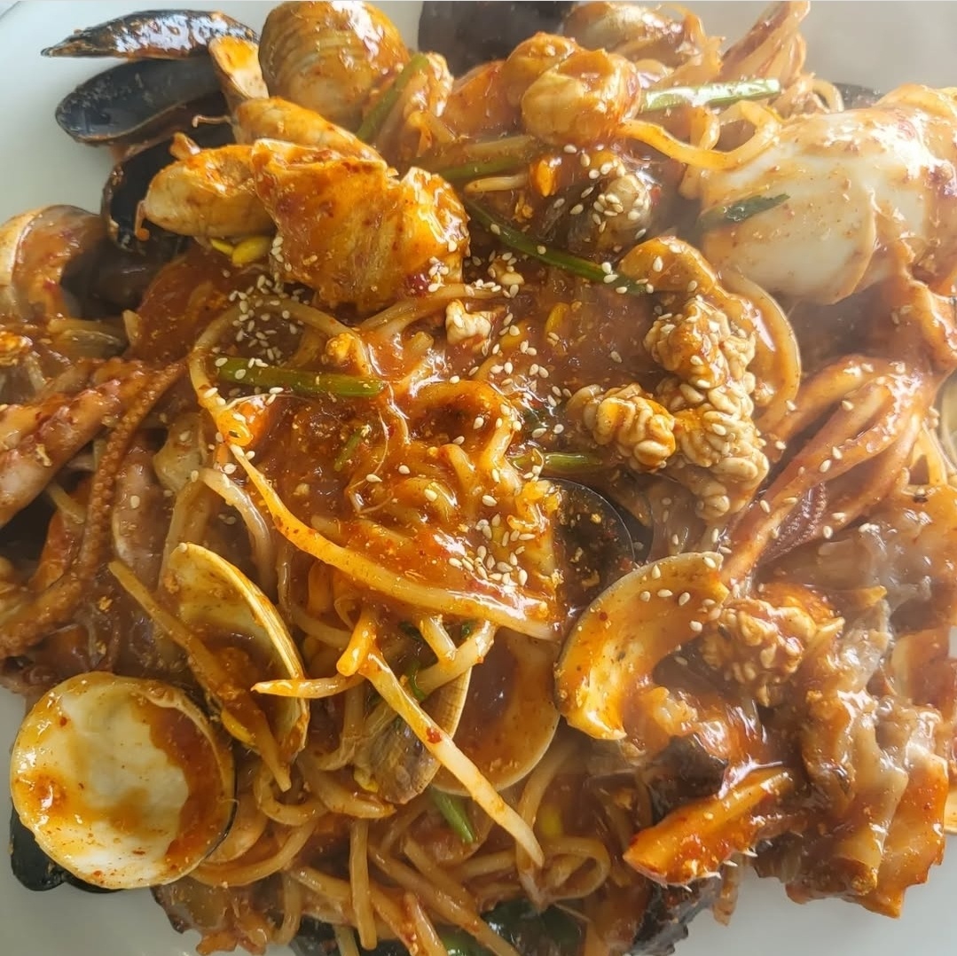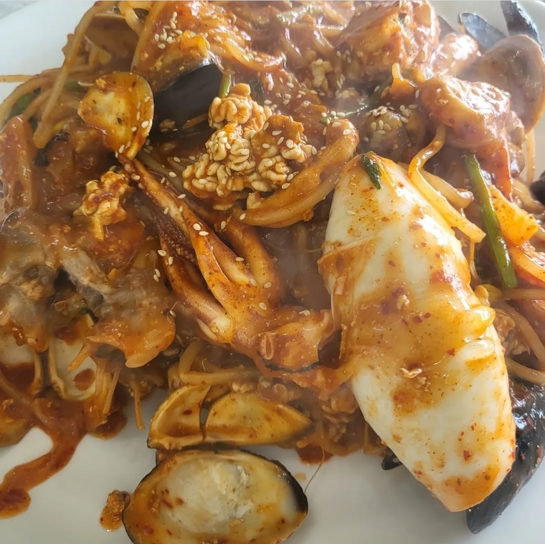 오징어, 바지락, 홍합, 콩나물 등 해물이 푸짐하게 들어간 볶음요리.
