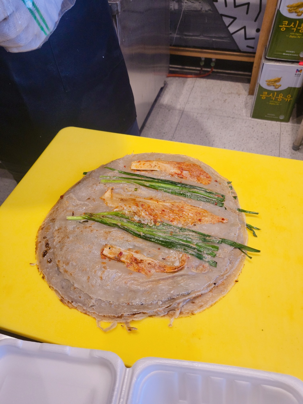 기름기가 적고 담백한 얇은 메밀전은 부추와 김치의 조화가 일품입니다. 커다란 한 장으로도 든든하게 즐길 수 있어요.