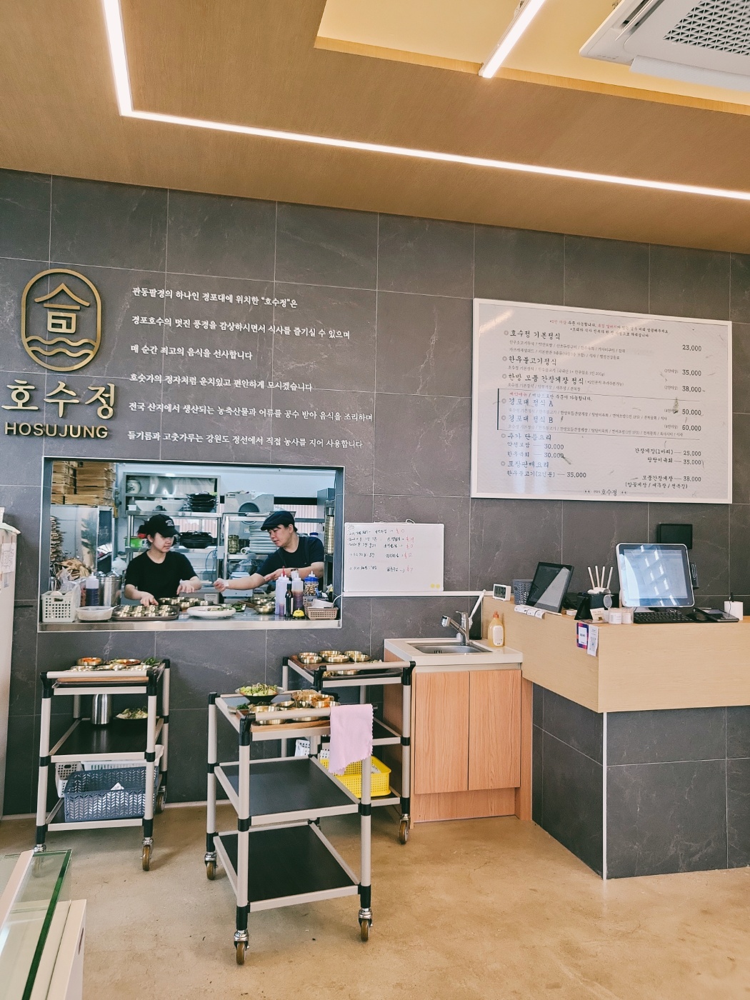 | 🦐경포대 정식 A | 호수정 기본정식 + 한우육회, 한우불고기, 시샤, 전복장, 모듬간장게장, 모듬해물구이 | 50,000원 |