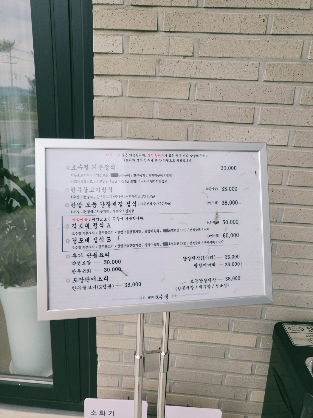 | 🥩한우불고기정식 | 호수정 기본정식 + 한우육회, 한우불고기(등심/양지), 시샤, 전복장 | 35,000원 |