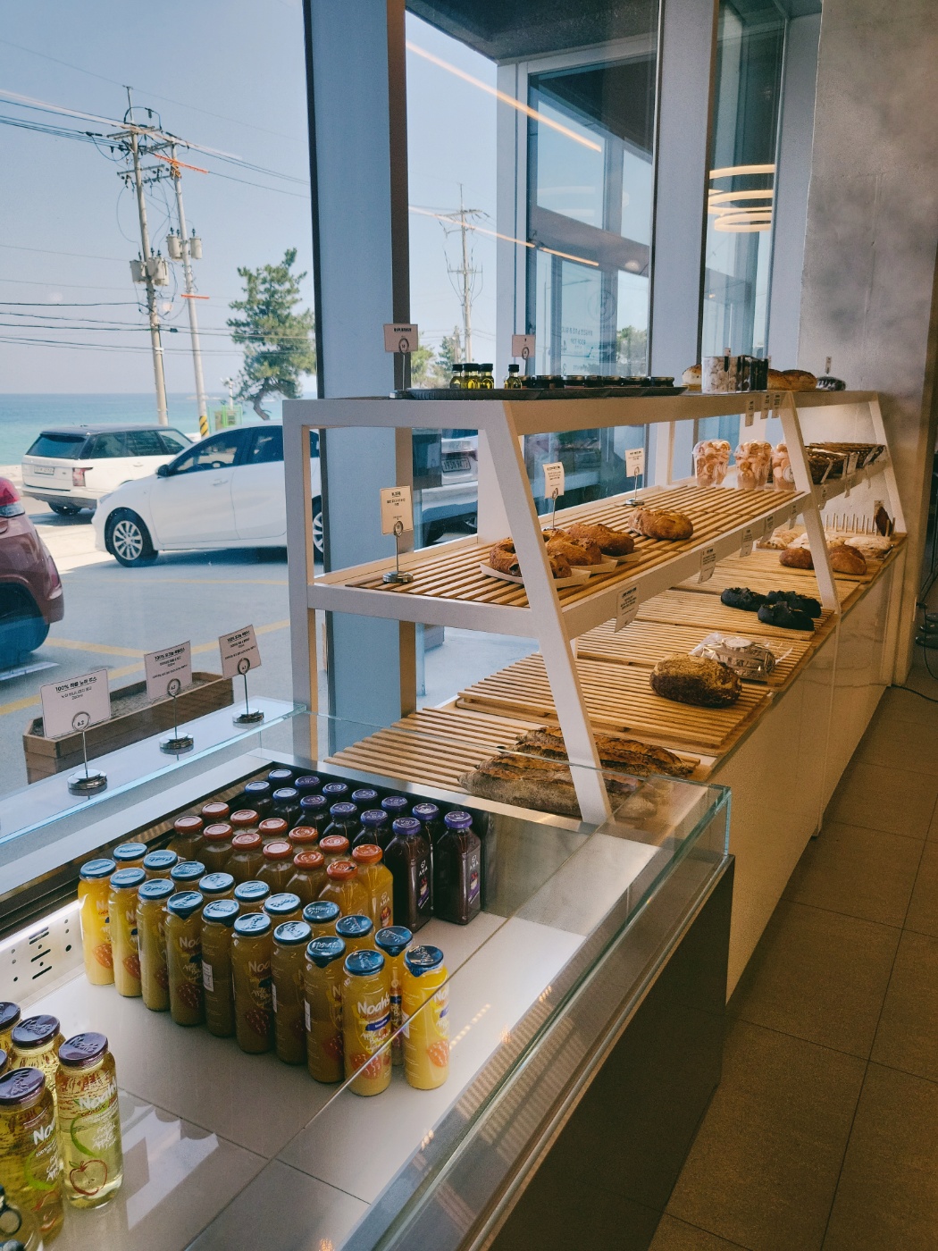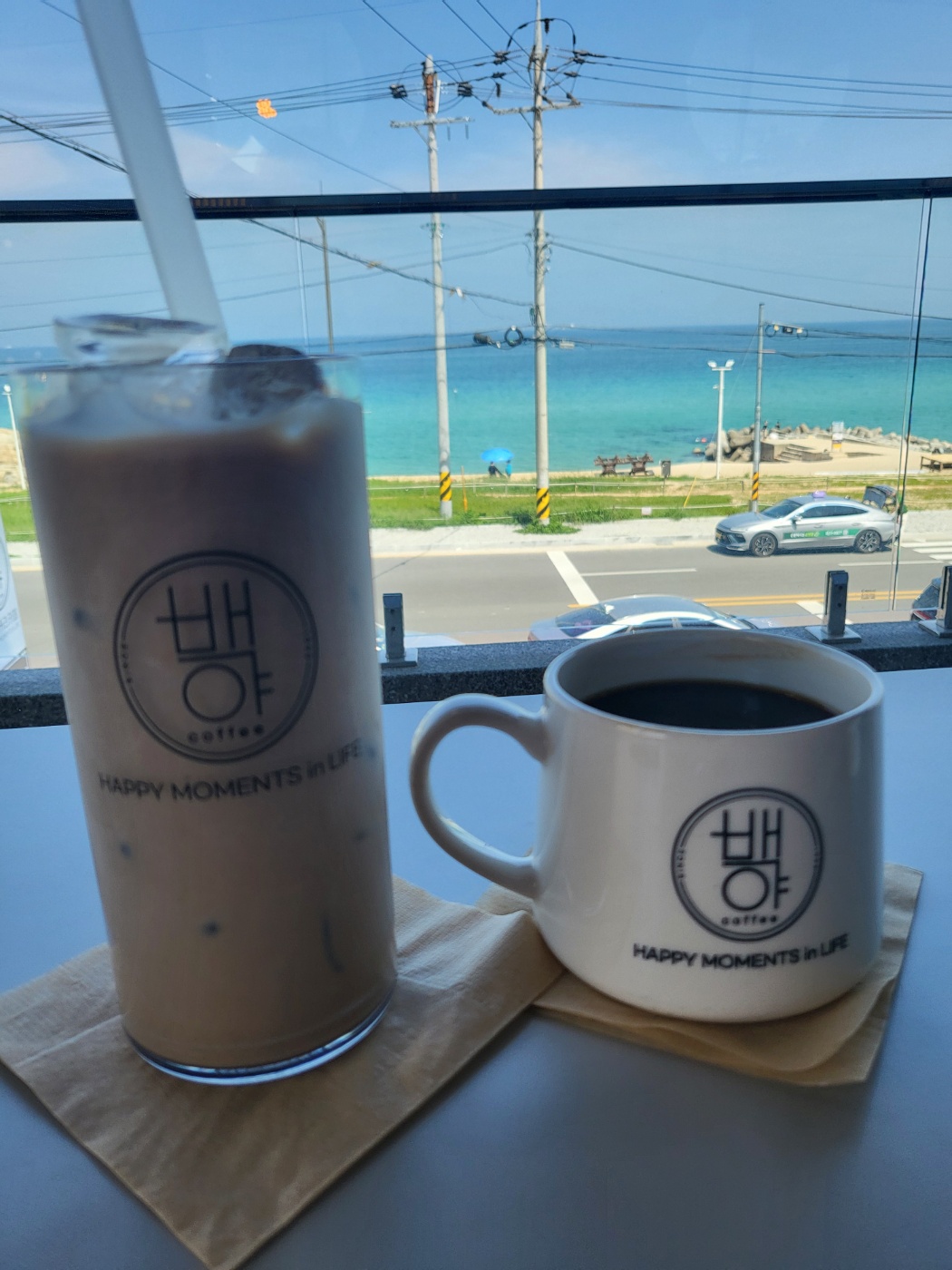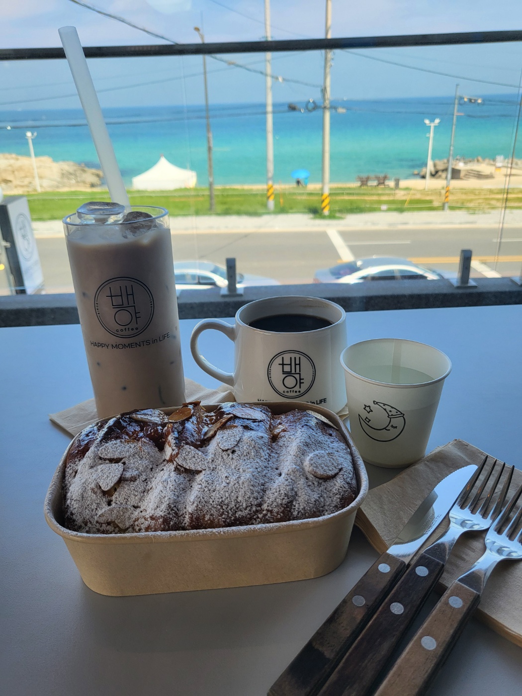 시원한 창밖의 에메랄드빛 바다와 달콤한 빵, 향긋한 커피가 함께하니