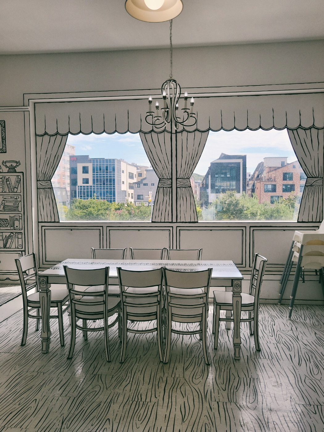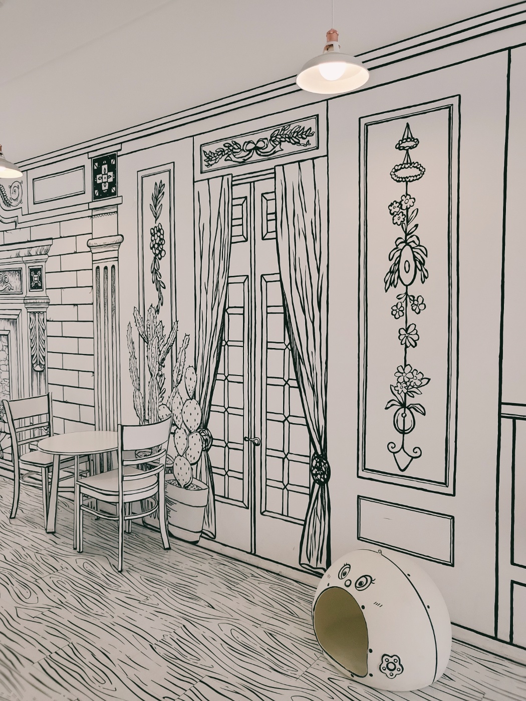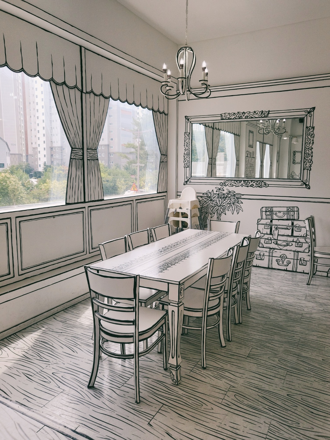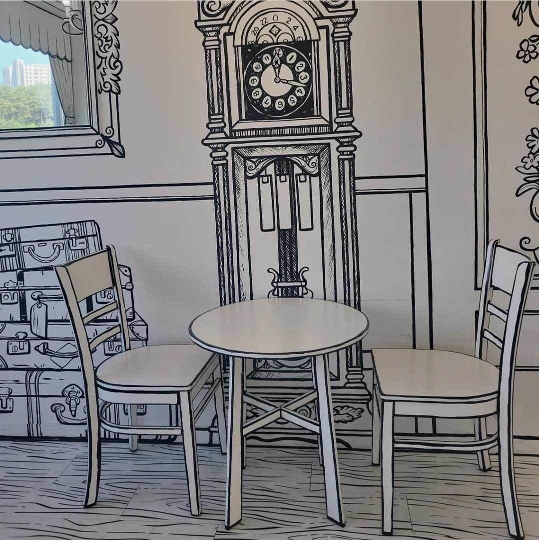 벽, 의자, 테이블까지 모두 흑백 선으로 표현된 2D 만화풍 디자인이라