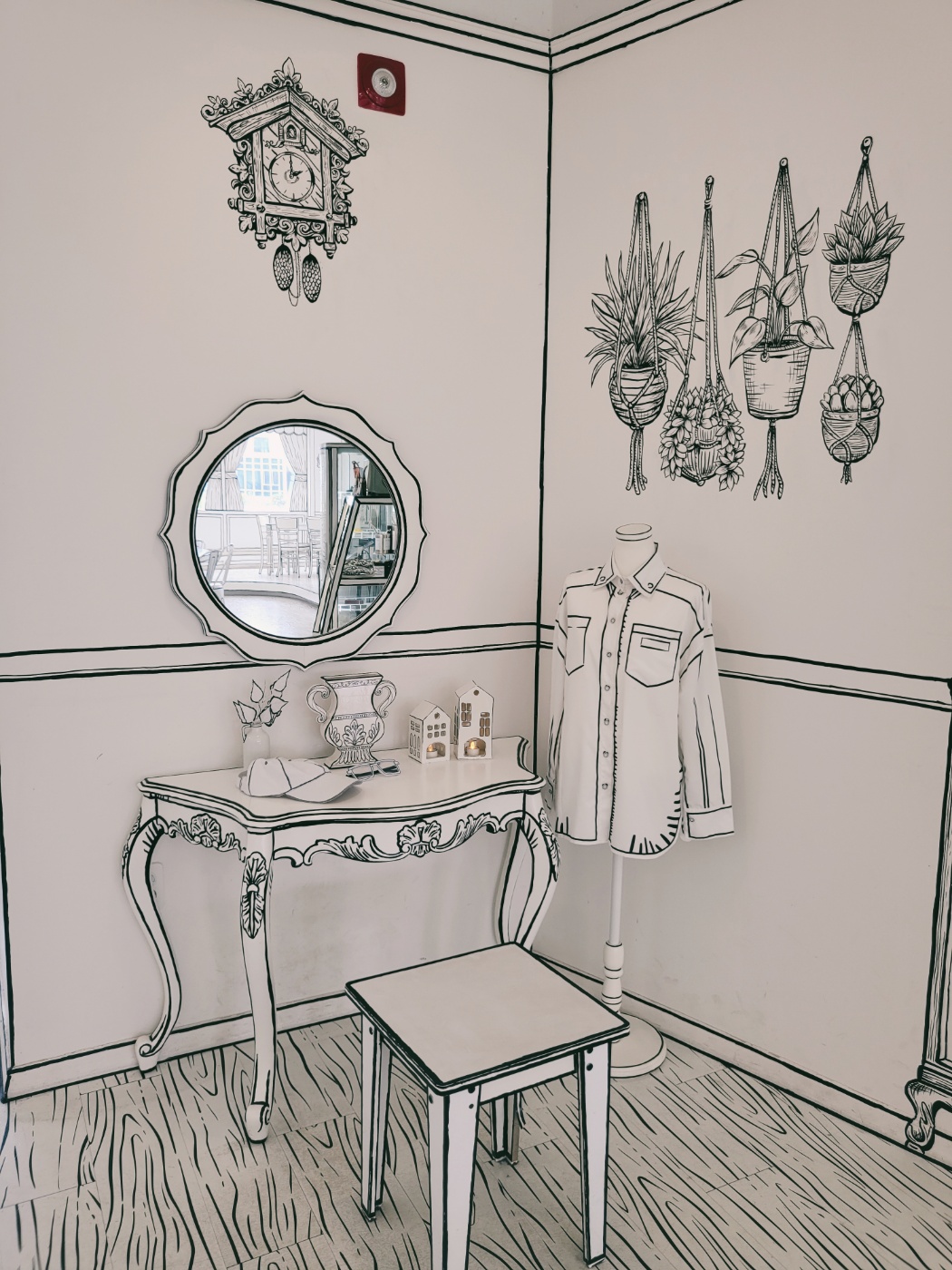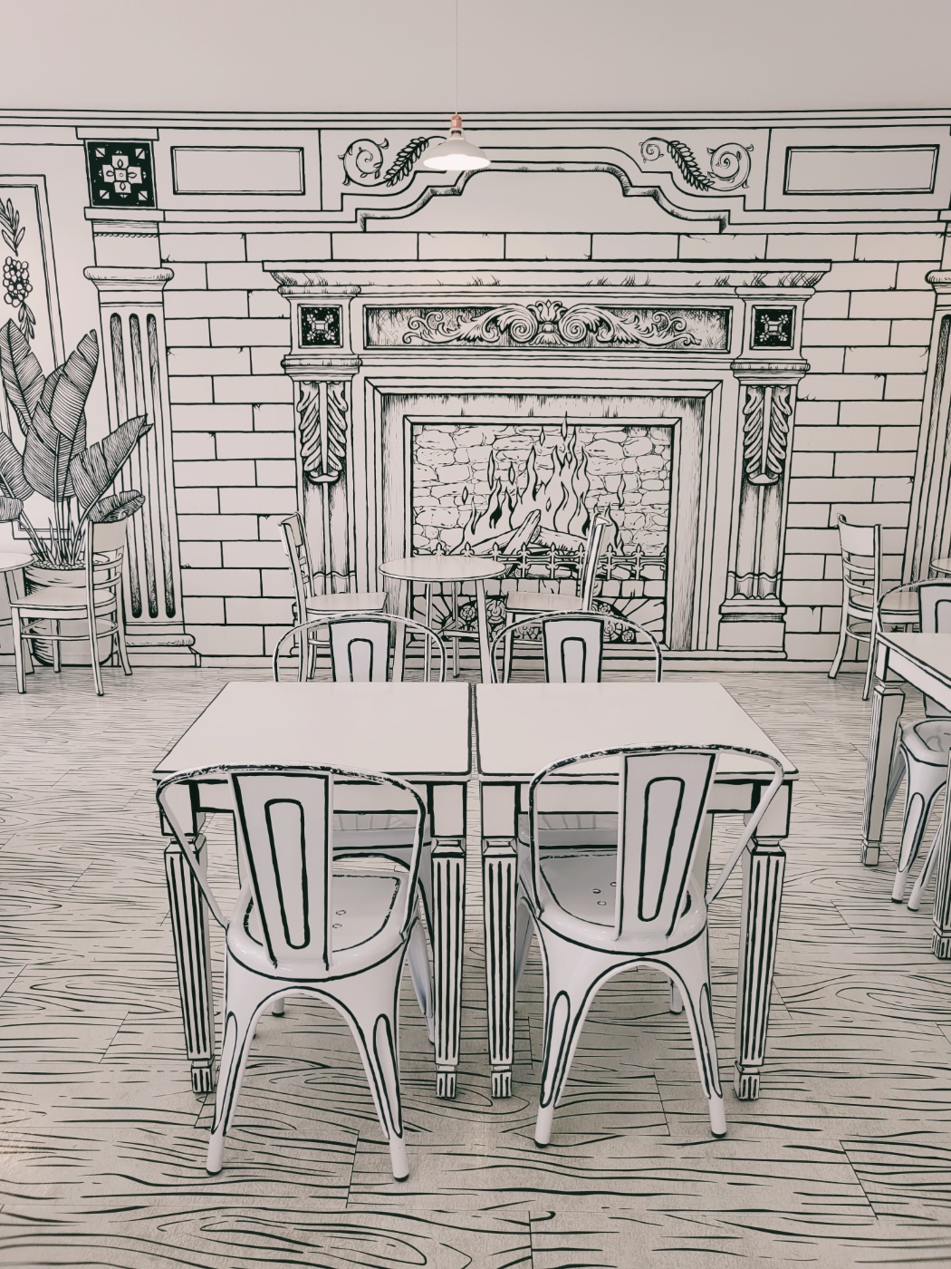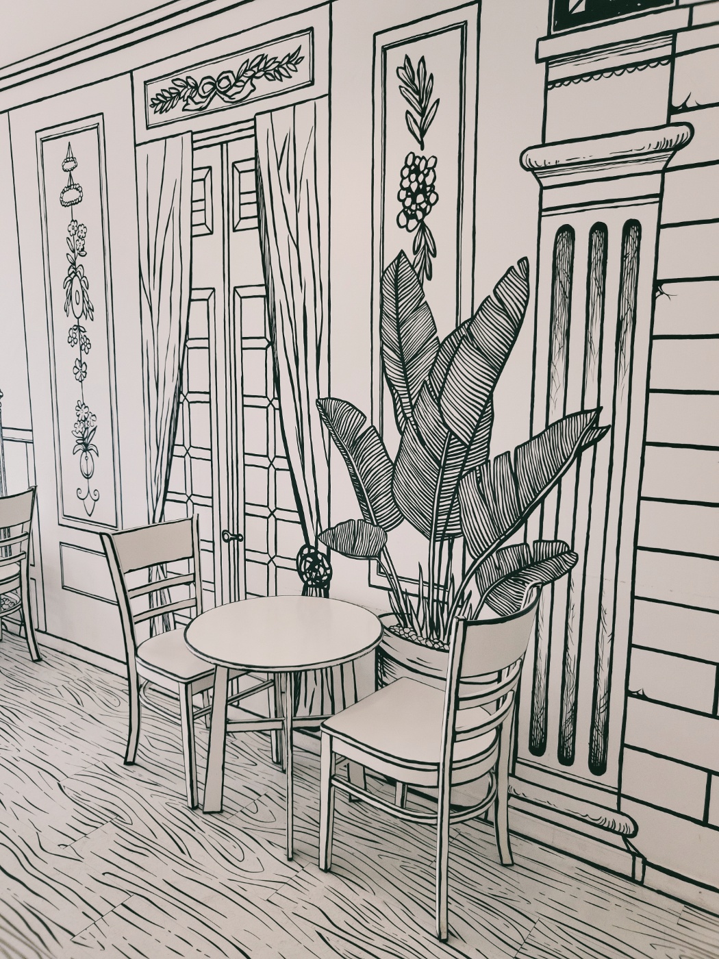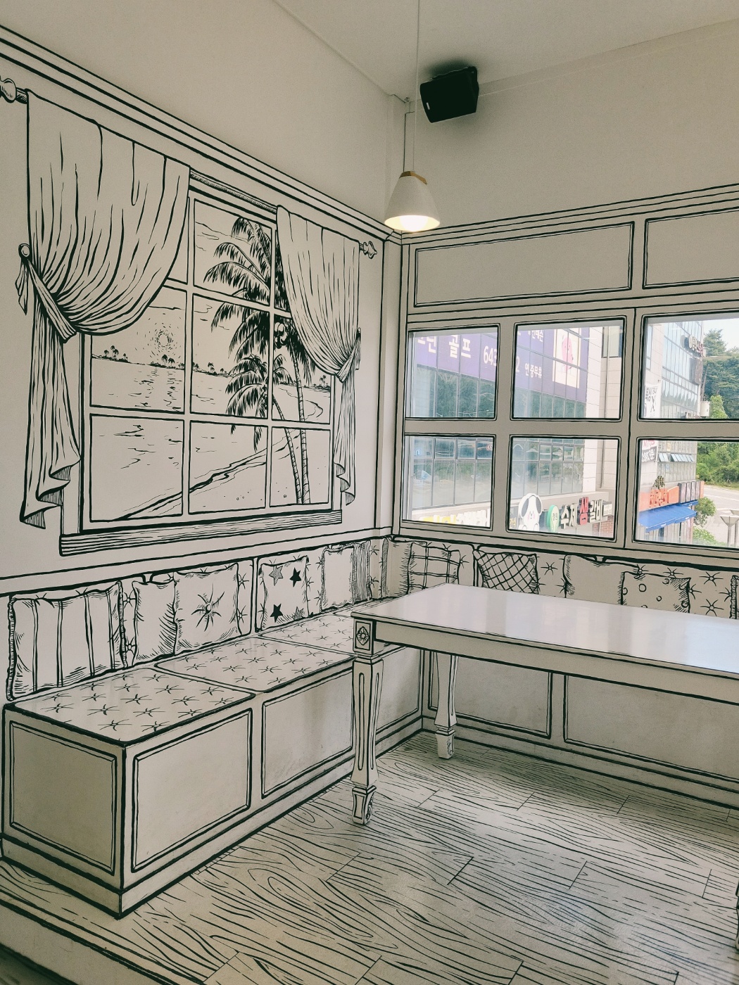 벽, 의자, 테이블까지 모두 흑백 선으로 표현된 2D 만화풍 디자인이라