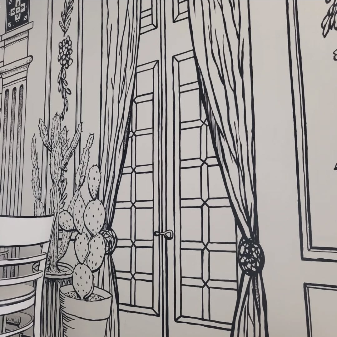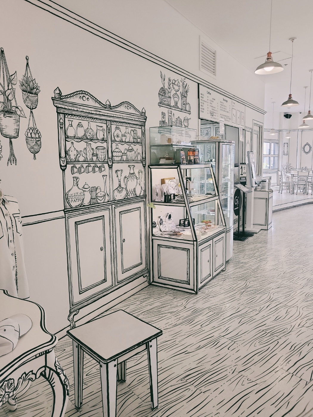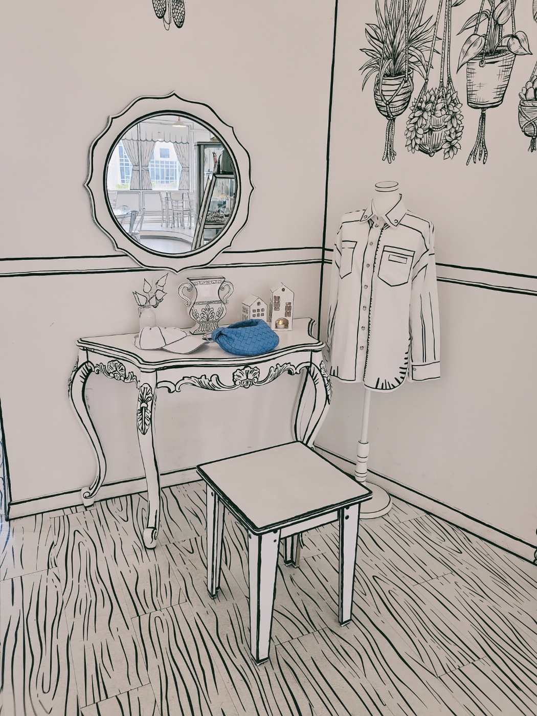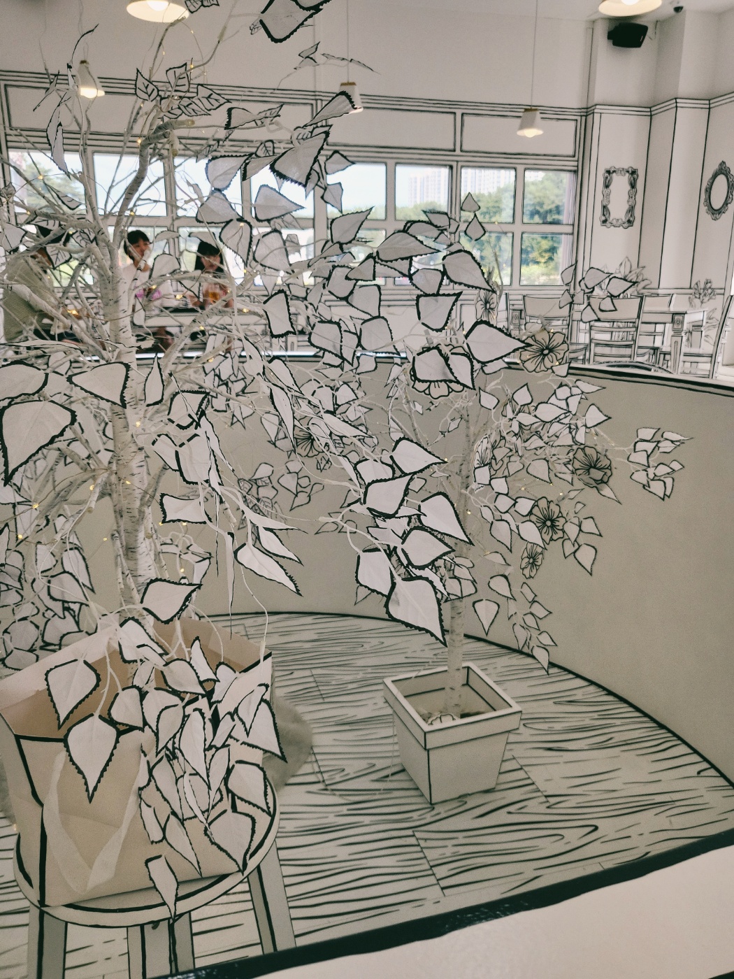 벽, 의자, 테이블까지 모두 흑백 선으로 표현된 2D 만화풍 디자인이라