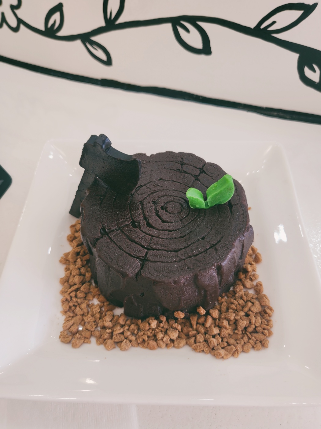 나무 결 모양을 그대로 살린 진한 초코케이크에 도끼 모양 초콜릿이 꽂혀 있어 보는 재미가 쏠쏠했어요.