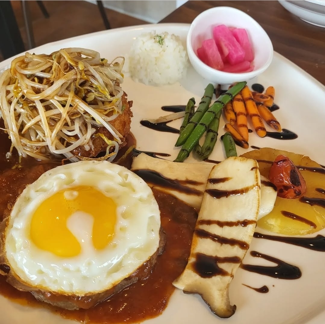 - 옆에는 함박스테이크와 계란 프라이가 올라가 있어요.