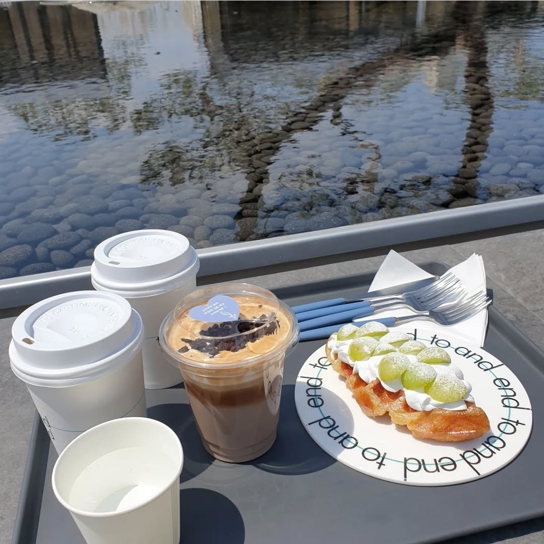 📷 아래 사진처럼, 연못에 비친 하늘과 나무, 그리고 커피 한 잔이 어우러진 풍경은 그 자체로 힐링입니다.
