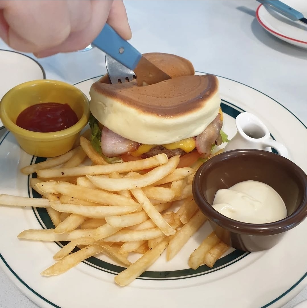 레트로 감성 제대로! 폭신한 팬케이크 번에 두툼한 패티, 치즈, 베이컨까지 들어가서 단짠단짠의 매력이 최고였어요.