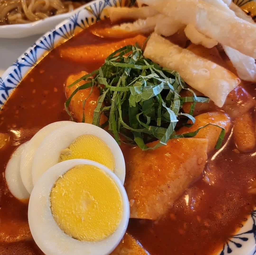 쫄깃한 밀떡에 깻잎 고명, 수제 튀김, 삶은 계란까지 푸짐하게 올라간 구성!
