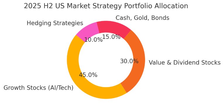 📌 모멘텀 지속 기술·AI·소비 중심 성장주 40~50% 🛡️ 방어 및 안정성 확보 가치주, 배당주, 필수소비재 30% 💵 현금/금/채권 유동성 및 금리 대응 10~15% ⚠️ 헤지 전략 변동성 ETF, 옵션 5~10%