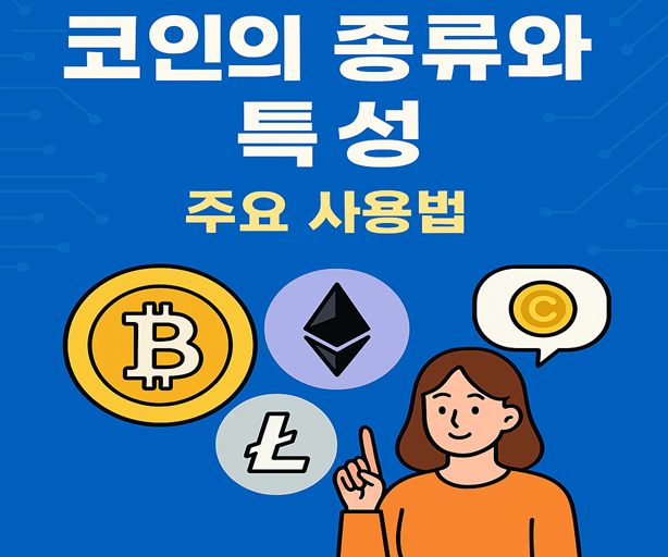 📌 암호화폐, 어디까지 알고 계신가요?코인의 종류부터 사용법까지 한눈에 정리!암호화폐(코인)는 블록체인 기술을 기반으로 한 디지털 자산입니다.비트코인부터 시작해 이제는 수천 개 이상의 암호화폐가 존재하며, 기술적 구조와 사용 목적에 따라 다양하게 분류됩니다.이번 글에서는 코인의 종류, 특성, 사용법을 자세히 소개합니다.🔹 1. 코인의 종류암호화폐는 크게 코인(Coin)과 토큰(Token)으로 나뉩니다.이 둘은 블록체인 존재 여부로 구분할 수 있어요.✅ (1) 코인(Coin) – 자체 블록체인을 가진 암호화폐코인 이름주요 목적특징비트코인 (BTC)디지털 화폐탈중앙화, 공급량 2100만 개 제한이더리움 (ETH)스마트 계약, DApp 플랫폼다양한 토큰 발행 가능라이트코인 (LTC)빠른 결제 수단비트코인보..